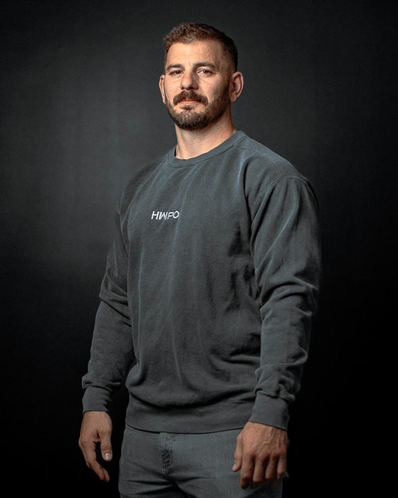 This unisex grey crewneck sweatshirt is a season staple. Wear over your gym gear to warm-up, or with jeans on the weekend. Featuring a small, centered stitched HWPO logo, its warm and lived in feel will make it your favorite top layer. Made of 80% Ring Spun US Cotton / 20% Polyester, minimal shrinkage expected at home. For an oversized fit, please size up.