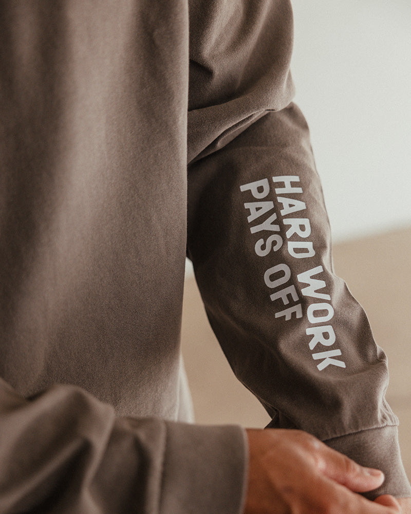 Heavyweight with a relaxed, boxy fit and garment-dyed finish. This long sleeve is built to last and wear in, not out. Soft, durable 100% cotton that stands up to real work, featuring a center-chest logo and on-sleeve mantra.
